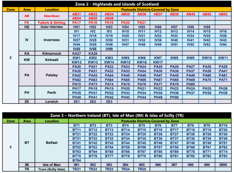 There are surcharges applied to certain postcodes around the UK. This includes the Highlands & Islands of Scotland, the Isle of Man, The Isles of Scilly and the Isle of Wight.